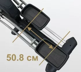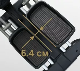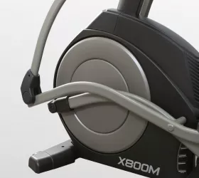 X800M обладает рядом преимуществ в биомеханических свойствах. Среди них бесконтактная электромагнитная приводная система высшего класса (индукционный тормоз EMS) и сбалансированный маховик с инерционным весом 25 кг. Расположенный спереди маховик позволяет значительно лучше настроить общую траекторию движения, уменьшить расстояние между педалями и проще добиться увеличения длины шага. Расстояние между педалями для BRONZE GYM X800M составляет всего 6,4 см (супермалый Q-Фактор), длина шага равна 50,8 см. Мягкое педалирование и равномерное распределение нагрузки на всем цикле движения осуществляется за счет супернадежного литого шатуна в педальном узле с использованием качественных подшипников. За плавное и тихое скольжение отвечают сдвоенные полиуретановые ролики коммерческого класса, которые передвигаются по усиленным парным направляющим. Последние обеспечивают как устойчивость тренажера, так и его надежность. Важной особенностью эллиптического эргометра является возможность изменять угол наклона. Для эллиптических тренажеров это довольно редкая опция. Угол наклона изменяется механическим путем до 15%, что позволит разнообразить тренировочный процесс и добавить интенсивности.