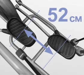 Помимо технологии "плавающих педалей"Advanced Suspension Tracking™, XE902 PRO обладает рядом других важных преимуществ. Безусловно, важна рама - иначе тренажер просто не выдержит высокоинтенсивных нагрузок. XE902 PRO построен с использованием сварного профиля максимальной прочности (Ultra Heavy Gauge Steel). Именно поэтому нетто вес изделия составляет внушительные 141 кг, а максимальный вес рассчитан на пользователей до 180 кг. Великолепная плавность хода обеспечивается электромагнитной приводной системой на базе EMS генератора (тренажер не требует подключения к сети), cбалансированным маховиком с инерционным весом 26,4 кг. и используемые в сочленениях немецкими подшипниками FAG. Длина шага 52 см. достаточна для комфортной эффективной тренировки. Расстояние между педалями (супермалый Q-Фактор E.S.Q.F.™) составляет всего 3 см.