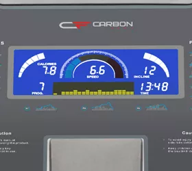 CARBON FITNESS T906 ENT HRC - беговая дорожка премиального уровня, одинаково подходящая для использования в домашних условиях либо небольших корпоративных залах. Двигатель мощностью 3.5 л.с. постоянного тока, беговое полотно Club Grade размером 150*48 см., скоростной режим от 1 до 20 км./ч. и угол наклона от 0 до 15% - все эти характеристики относят T906 ENT HRC к классу полукоммерческих беговых дорожек. Амортизационная система построена на базе современной перспективной технологии динамических сотовых подушек (Cell-S™). Многофункциональный дисплей с диагональю 7 дюймов (17.8 см.) выводит на экран все основные параметры тренировки, включая профиль тренировочных программ. В программный пакет входит 15 предустановленных программ различного назначения, а также самостоятельно регулируемый ручной режим. Помимо этого, можно создать собственную программу в одном из 3-ех пользовательских режимов или обратиться к пульсозависимым программам. На стыке комфорта и эффективности находится функция беспроводного определения частоты сердечного ритма (приемник сигнала уже встроен в консоль, а нагрудный ремень-передатчик приобретается отдельно). Как и любая другая программа, пульсозависимая тренировка длится не менее 20 минут - очевидно, что постоянно держать руки на сенсорных датчиках пульса крайне неудобно, да и к тому же они могут давать достаточно большую погрешность измерения. Разнообразить тренировку поможет мультимедийная составляющая - в консоль дорожки встроены колонки мощностью 4 Ватта, а носителями аудио файлов выступают USB накопитель либо подсоединяемый смартфон. За удобство складывания отвечает двухфазная гидравлическая система Easy Drop™ - она существенно облегчает складывание тренажера, а при раскладывании обеспечивает медленное опускание полотна в последней фазе, гарантируя легкость и безопасность. Перемещение дорожки происходит за счет 2-ух транспортировочных роликов.