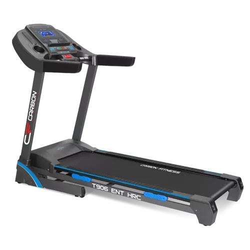 CARBON FITNESS T906 ENT HRC - беговая дорожка премиального уровня, одинаково подходящая для использования в домашних условиях либо небольших корпоративных залах. Двигатель мощностью 3.5 л.с. постоянного тока, беговое полотно Club Grade размером 150*48 см., скоростной режим от 1 до 20 км./ч. и угол наклона от 0 до 15% - все эти характеристики относят T906 ENT HRC к классу полукоммерческих беговых дорожек. Амортизационная система построена на базе современной перспективной технологии динамических сотовых подушек (Cell-S™). Многофункциональный дисплей с диагональю 7 дюймов (17.8 см.) выводит на экран все основные параметры тренировки, включая профиль тренировочных программ. В программный пакет входит 15 предустановленных программ различного назначения, а также самостоятельно регулируемый ручной режим. Помимо этого, можно создать собственную программу в одном из 3-ех пользовательских режимов или обратиться к пульсозависимым программам. На стыке комфорта и эффективности находится функция беспроводного определения частоты сердечного ритма (приемник сигнала уже встроен в консоль, а нагрудный ремень-передатчик приобретается отдельно). Как и любая другая программа, пульсозависимая тренировка длится не менее 20 минут - очевидно, что постоянно держать руки на сенсорных датчиках пульса крайне неудобно, да и к тому же они могут давать достаточно большую погрешность измерения. Разнообразить тренировку поможет мультимедийная составляющая - в консоль дорожки встроены колонки мощностью 4 Ватта, а носителями аудио файлов выступают USB накопитель либо подсоединяемый смартфон. За удобство складывания отвечает двухфазная гидравлическая система Easy Drop™ - она существенно облегчает складывание тренажера, а при раскладывании обеспечивает медленное опускание полотна в последней фазе, гарантируя легкость и безопасность. Перемещение дорожки происходит за счет 2-ух транспортировочных роликов.