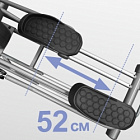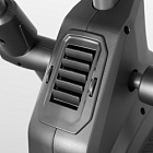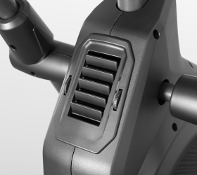 Тренировочная консоль BRONZE GYM XR812 LC рассчитана на коммерческое использование и представляет собой LED дисплей и 4 буквенно-цифровых экрана. Основной LED дисплей отображает программные профили, а буквенно-цифровые экраны выводят все необходимые параметры тренировки. В число самих программ входят 22 различных режима, куда относятся 12 предустановленных программных профилей, ручной режим, 4 пульсозависимые и 4 пользовательские программы, а также Ватт режим (диапазон нагрузки находится в диапазоне от 10 до 350 Ватт). Здесь также есть жироанализатор (Body Fat) и функция оценки восстановления организма после физических нагрузок (Recovery). Мультимедийная компонента представлена динамиками мощностью 3 Ватта, а также разъемом AUX IN для подключения мобильных устройств и воспроизведения через них аудио-файлов. Есть также USB вход, он используется для зарядки смартфонов и планшетов. Полезная опция - подставка под мобильные устройства, во время тренировки можно смотреть фильмы или серфить в интернете. Кстати, в XR812 LC предусмотрены 2 подставки - одна для телефона, вторая для планшета. Оригинально сделаны вентиляторы - их тоже два. Один направлен на лицо и шею, второй - на торс. Эллипс имеет транспортировочные ролики и компенсаторы неровностей пола. Максимальный вес пользователя 160 кг.