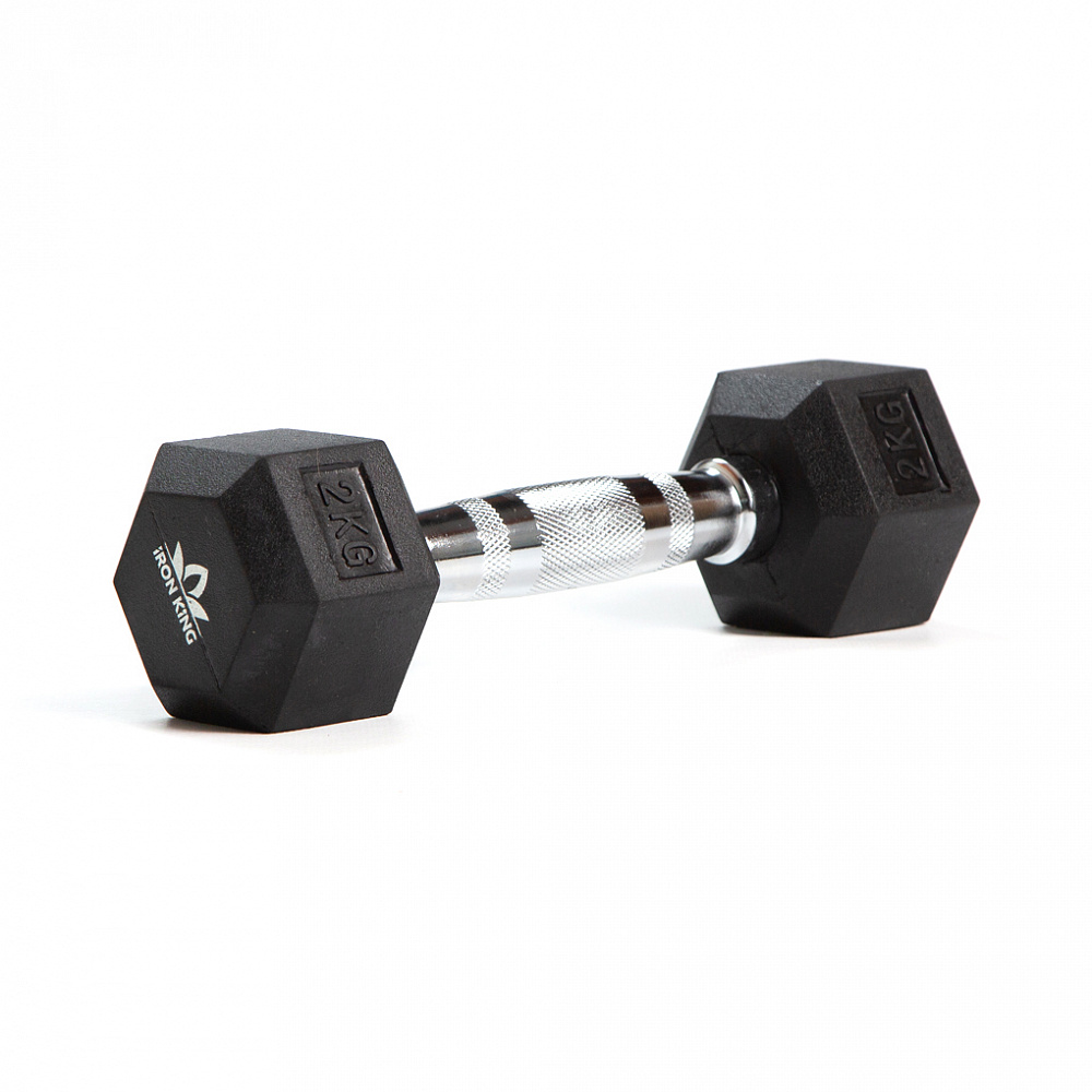Гексагональная обрезиненная гантель 2 кг. Цельнолитые утяжелители не соскользнут с рукояти в отличие от дисков. Резиновое покрытие не повреждает напольное покрытие при падении гантели.