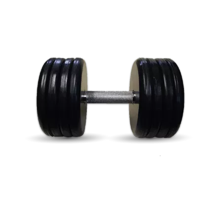 Гантели состоят из хромированных вращающихся ручек, наборных обрезиненных дисков диаметром 21,2 см и заглушек для предотвращения разукомплектации.