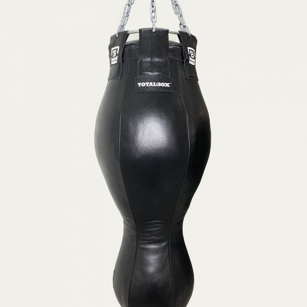 "Профессиональный боксерский мешок апперкотный TOTALBOX. Материал: натуральная прочная кожа; наполнитель: пенорезиновые гранулы/текстильное волокно; подвесная система: карабин, цепи, полукольца. исполнение: фигурный