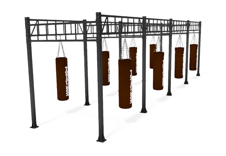 Рама боксерская несущая TOTALBOX. Материал: стойки - металлическая профильная труба 80х80 мм, верхние рамы 50х50. Порошковая окраска. На раме размещаются только мешки и груши. Размер по желанию Заказчика. Цена указана за размер 2,4х2.4х3 м. (для подвеса 4 боксерских мешков).
