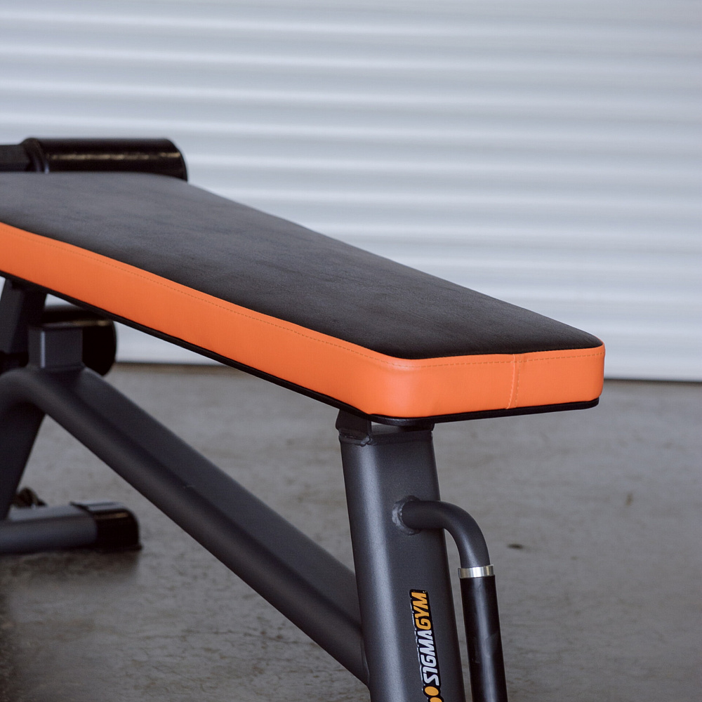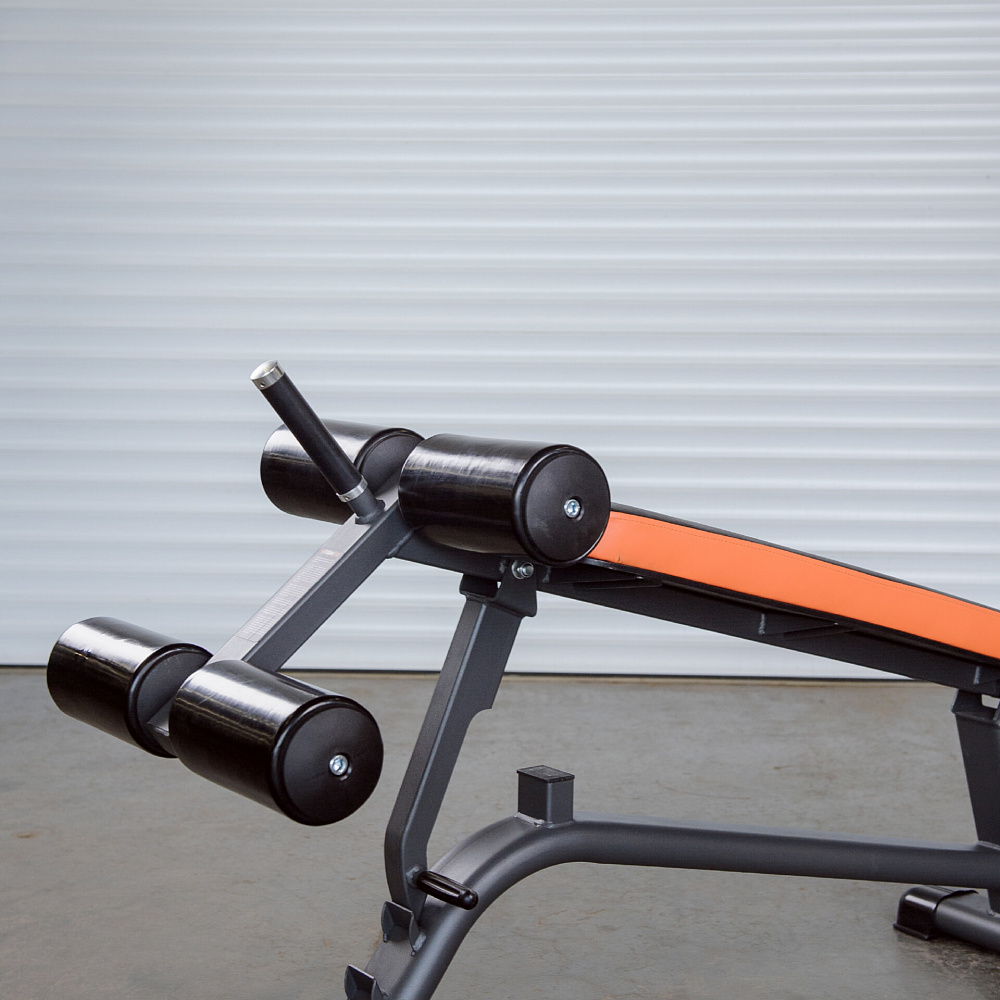 Основание скамьи выполнено из плоскоовальной трубы 100х50х2,5 мм. Благодаря мощнейшему каркасу, скамья имеет повышенную прочность, что благоприятно сказывается на безопасности тренировок и увеличивает износостойкость тренажера.