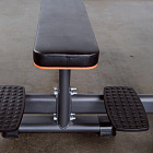 Основание скамьи выполнено из плоскоовальной трубы 100х50х2,5 мм. Благодаря мощнейшему каркасу, скамья имеет повышенную прочность, что благоприятно сказывается на безопасности тренировок и увеличивает износостойкость тренажера. На основании тренажера установлены импортные крюки для укладки штанг нескольких весов. В конструкции тренажера используются нескользящие опоры из пластика, предотвращающие повреждение напольного покрытия спортивного зала.
