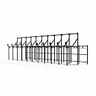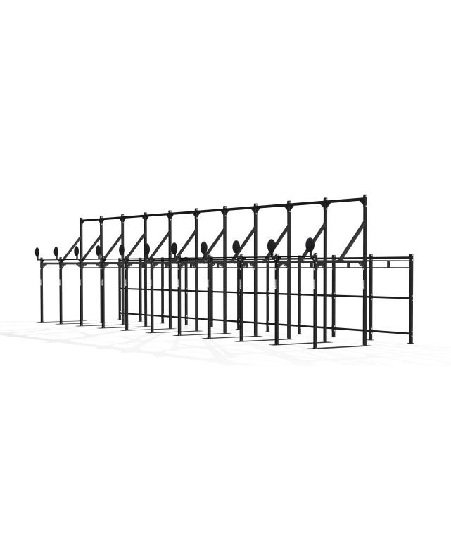 Рама, созданная специально для соревнований с 10 отделений, мишенью для бросков медбола, возможностью выполнять гимнастические упражнения, упражнения со штангой, а также лазать по канату Длина, мм 19100 Ширина, мм 4020 Высота, мм 4520 Общий вес, кг 2485,6